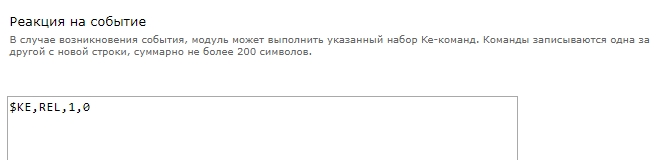 Следующий шаг пропускаем (квоты). На следующем шаге с помощью Ke-команд описываем реакцию на данное событие. А именно - выключаем первое реле (см. команду $KE,REL в Описании Ke-команд управления).