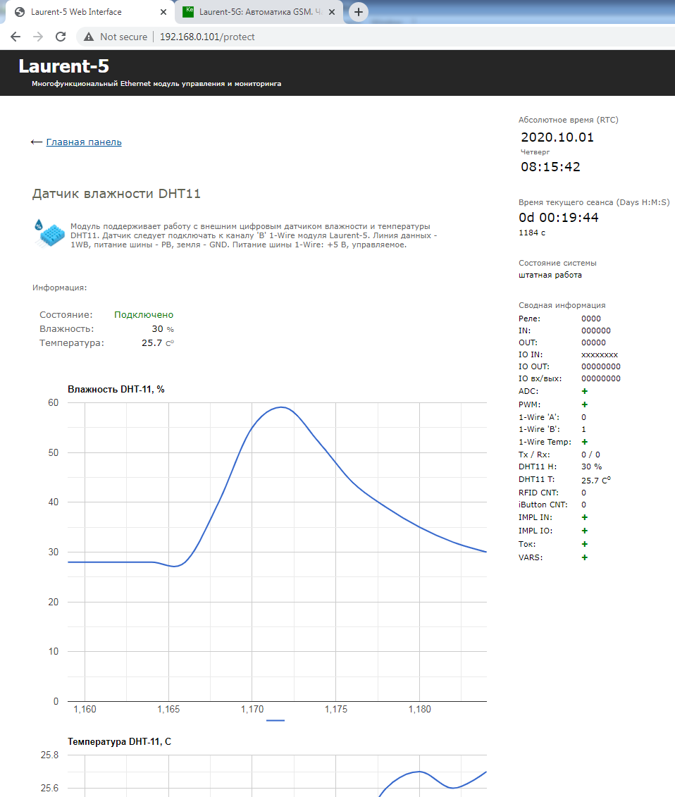 Заходим в WEB интерфейс платы по проводному Ethrenet соединению (IP по умолчанию 192.168.0.101) и в секции посвященной датчику влажности убеждаемся что все подключено верно и датчик выдает корректные показания.