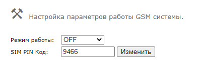 Проведем пуско-наладку GSM функционала. Наистроим его так что бы модуль сам автоматически выходил на связь (достаточно настроить один раз). Первым делом, укажем PIN код установленной SIM карты. Вводим код и нажимаем на кнопку "Изменить". Данные сохранятся в энергонезависимой памяти.