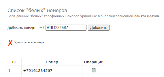 Последним шагом, добавим наш телефонный номер (на который должен придти тревожный звонок от модуля в случае тревоги) в базу "белых" номеров. В дальнейшем по ID этого номера (в данном случае, ID=1) мы сможем автоматически отправлять SMS и совершать звноки с модуля при возникновении событий.