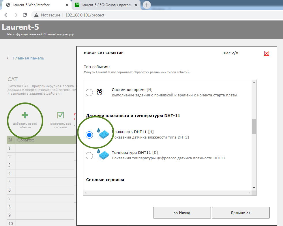 Создаем новое событие, тип [H] - показания датчика влажности DHT-11: