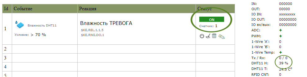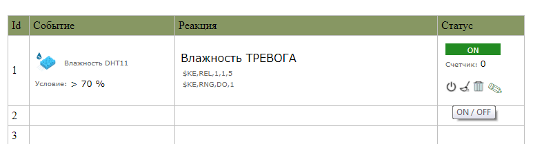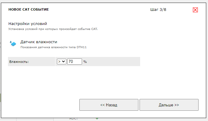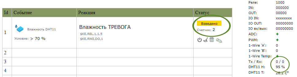 При этом, пока показания датчика не вернуться обратно в "зеленую" зону, событие будет находится в состоянии "ВЗВЕДЕНО". После того как влажность вернется в штатное положение, событие вновь будет в активном состоянии в ожидании превышения порога.