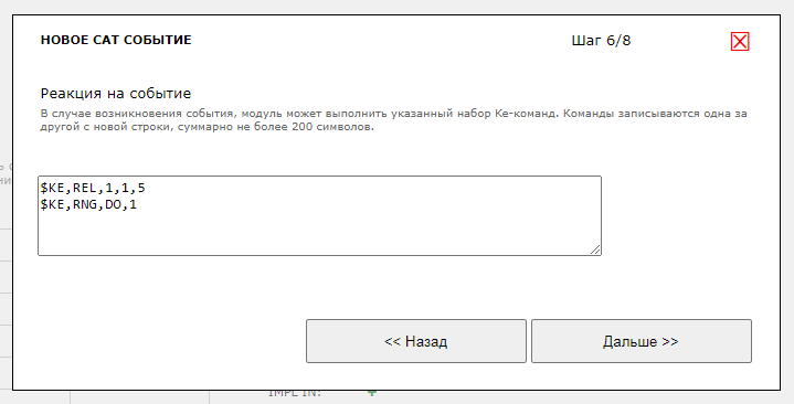 Указываем реакцию модуля на событие в виде списка Ke-команд управления. Полное описание всех поддерживаемых Ke-команд можно посмотреть в разделе Документация, "Описание Ke-команд управления".