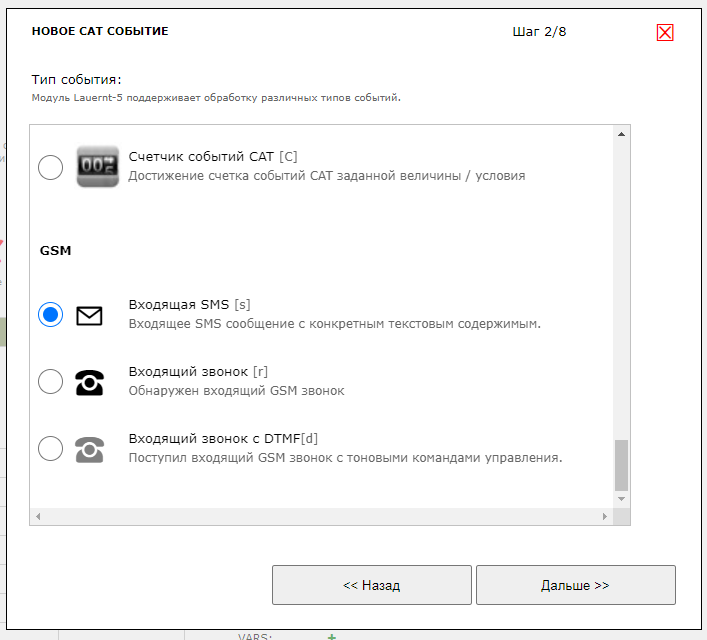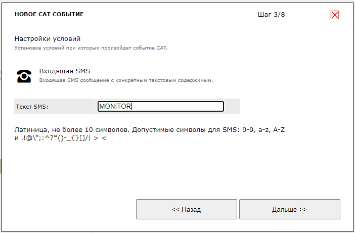 Настроим событие так что бы оно срабатывало когда на номер GSM модема в модуле Laurent-5G приходит SMS с текстом MONITOR.