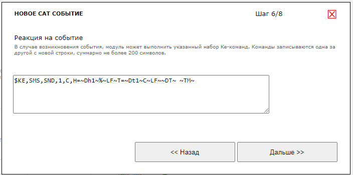 Реакция на событие оформлена в виде вызова следующей KE-команды. Она произведет отправку SMS сообщения с текстом H=~Dh1~%~LF~T=~Dt1~C~LF~~DT~ ~TM~ (содержащим динамические переменные) на "белый" номер под ID=1.