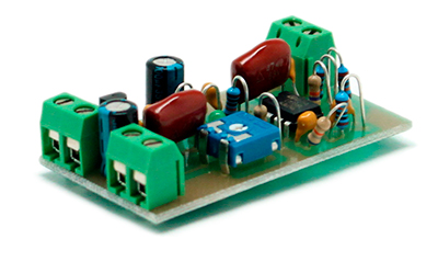 Этот неинвертирующий фильтр второго порядка выполнен на сдвоенном операционном усилителе LM358. Частота среза фильтра – 100 Гц. Установленный на плате светодиод индицирует наличие напряжения питания, подстроечным резистором можно регулировать уровень входного сигнала. Фильтр устанавливается между линейным выходом источника сигнала и входом усилителя мощности сабвуфера. Геометрия устройства позволяет монтировать его в разрыв сигнального провода. Для подключения питающего напряжения и сигнальных проводов предусмотрены парные клеммные винтовые зажимы.