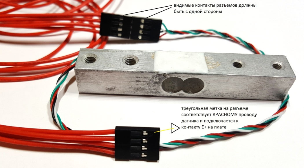 В набор с 4-мя датчиками входит комплект удлинительных кабелей, который состоит из 4-х плоских шлейфов. При подключении удлинительного кабеля к разъему платы треугольная метка на разъеме должна подключаться к верхнему контакту на разъеме платы. На рисунке он обозначен Е+.
