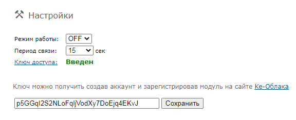 Нажимаем на ссылку “Ключ доступа” и в появившееся окно ввода копируем Ключ (текстовая строка длиной 32 символа) из интерфейса Ke-Облака (показано на рисунке ниже). Нажимаем на кнопку “Сохранить”.