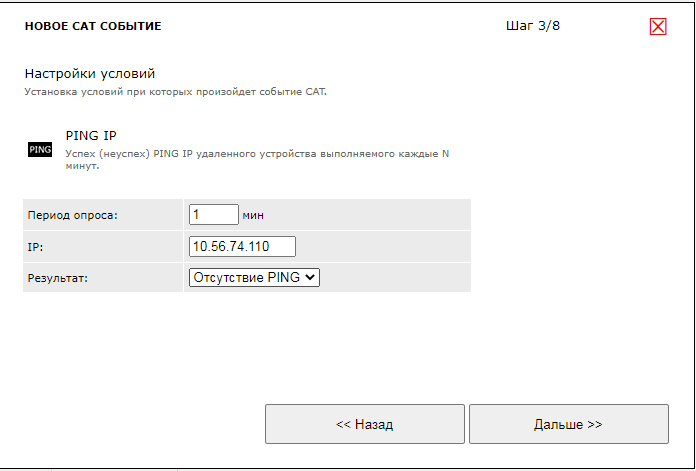 Указываем IP хоста, который будем пинговать. А так же указываем, что это событие должно срабатывать в случае провала операции PING (хост не ответил).