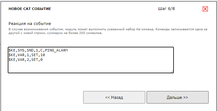 С помощью команды $KE,SMS,SND отправляем SMS с текстом PING_ALARM на первый номер в базе "белых" телефонных номеров модуля. С помощью команды $KE,VAR устанавливаем VAR_1 = 10, VAR_2 = 0.