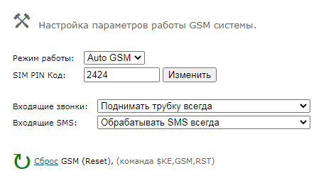Укажем PIN код установленной SIM карты. Вводим код и нажимаем на кнопку "Изменить". Данные сохранятся в энергонезависимой памяти. Далее, выбираем AUTO режим работы GSM модема - т.е. при наличии установленной SIM карты и корректном PIN коде модуль будет всегда пытаться выйти в сеть GSM и зарегистрироваться в ней.