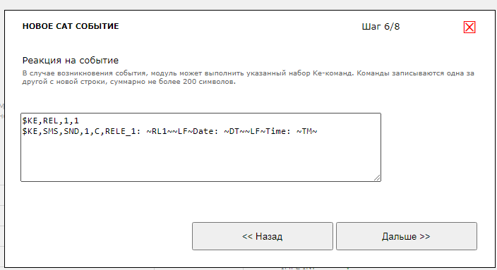 Теперь реакция. Как обычно для модулей Laurent-5 / 5G задаем ее в виде списка Ke-команд управления. Первым шагом, например, включим 1-ое реле с помощью команды $KE,REL. Далее отправим SMS на номер в "белой" базе с ID=1 в которой отразим факт включения реле через динамическую переменную ~RL1~. При формировании текса SMS для отправки данная переменная будет заменена на текущее состояние реле.