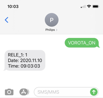 Если теперь отправить SMS с текстом "VOROTA_ON" (регистр символом имеет значение) на номер SIM карты в модуле Laurent-5G как в скором времени мы услышим щелчок включения 1-го реле и получим SMS с подтверждением факта приема команды и текущим состоянием 1-го реле.