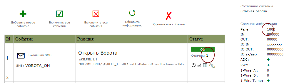 Факт обработки события так же можно наблюдать через увеличение счетчика срабатываний. На компактной панели справа можно увидеть так же факт изменения состояния 1-го реле: