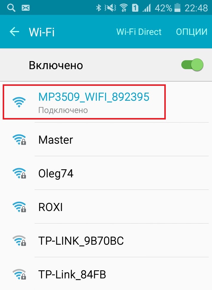 Перейдите в список сетей WiFi вашего смартфона и подключитесь к развёрнутой модулем сети MP3509_WIFI (6 цифр в конце будут уникальны для каждого экземпляра MP3509). Подключение произведётся без запроса пароля.