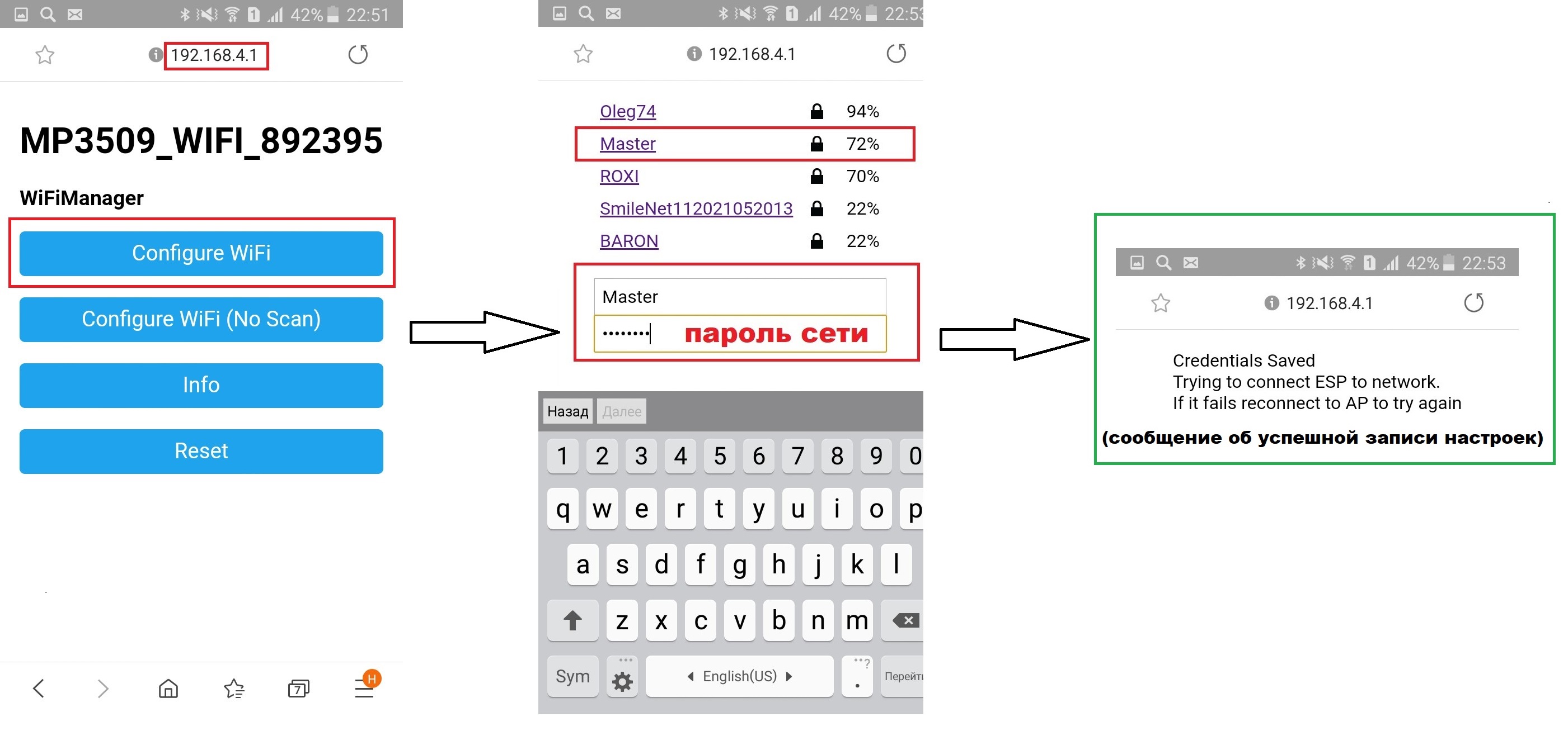 После этого наберите в браузере смартфона сетевой адрес 192.168.4.1, Вы должны перейти на Web-сервер. Нажмите на вкладку «Configure WiFi», затем выберите в списке доступных WiFi сетей домашнюю сеть Вашего роутера (на примере ниже «Master») и введите её пароль. Если всё прошло успешно, Вы увидите на экране смартфона сообщение об успешной записи настроек, а реле на модуле перестанет щёлкать. Кроме того, вернувшись в список WiFi сетей, Вы больше не найдёте сеть MP3509.