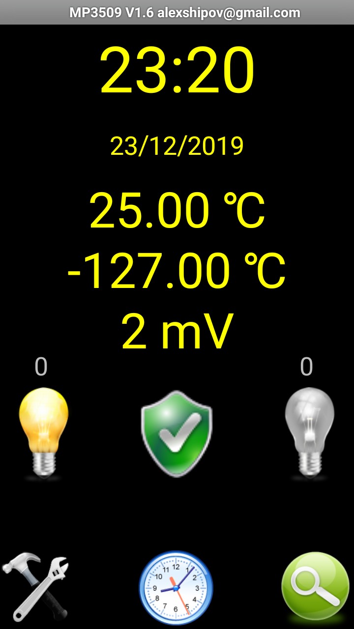 Давайте разберёмся в интерфейсе. Время и дата отображаются из настроек смартфона, так как в MP3509 нет энергонезависимых часов реального времени. 25.00 С – температура в комнате, измеренная первым датчиком; второй датчик не подключен, поэтому и отображается значение по умолчанию -127.00 С. Схема подключения цифровых датчиков температуры типа DS18B20 приведена на сайте и в инструкции, ничего сложного в этом нет.