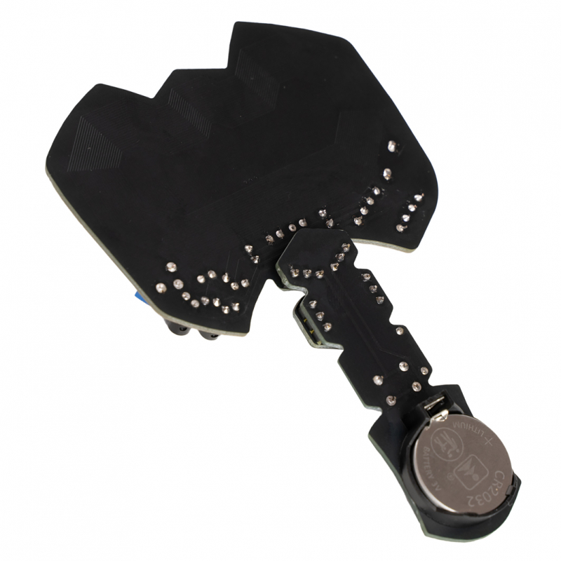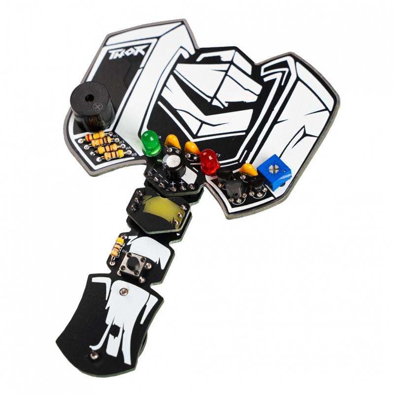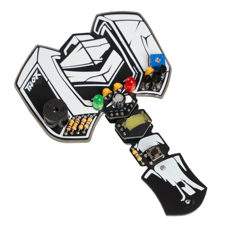 Техногаджет «Молот Грома» выполнен в виде электронного конструктора для обучения пайке. Осильте 68 точек паяльным жалом, вложите источник силы и вуаля — артефакт готов к охоте за сокровищами. Хватит теории — пора отправляться в приключение!