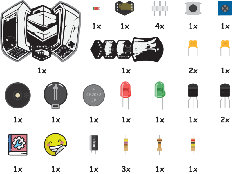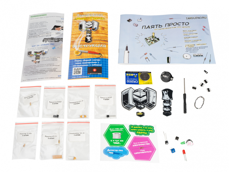 В коробке вы найдёте всё для сборки устройства: печатные платы, резисторы, конденсаторы, светодиоды и другие компоненты. В дар прилагаются припой и источник энергии. Для монтажа остаётся только найти паяльник, бокорезы и пинцет.