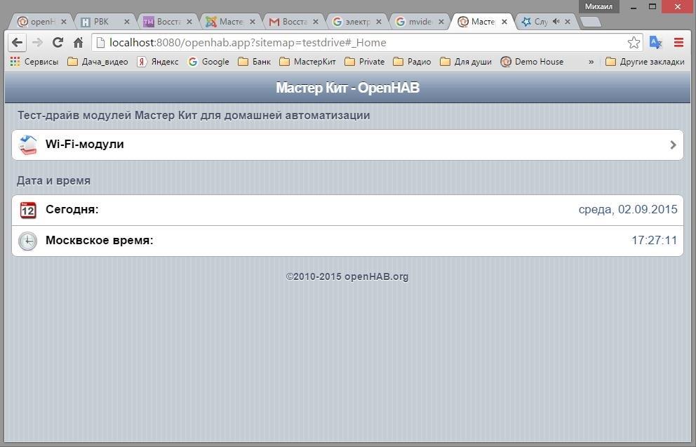 2. Интерфейс системы. Название конфигурации осталось прежним, поэтому и запускать ее будем так же. Наберите в командной строке браузера. (предполагаем, что OpenHAB у вас установлен на этом же компьютере, иначе вместо localhost следует набрать IP- адрес сервера OpenHAB в вашей сети).