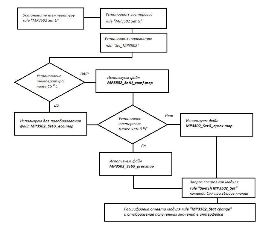Назначение элементов станет понятнее, если вы посмотрите на алгоритм управления модулем и описание правил (Rules).