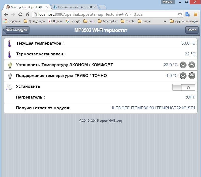 3. Описание в системе модуля MP3500 и способов управления им. Все элементы управления описываются в файле с расширением .items и находится он в папке C:\OpenHab\configurations\items. Приведу только строки, которые я добавил для этой статьи и которые относятся к термостату и определяют вид приведенной выше страницы: